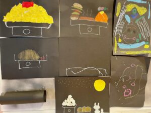 黒い画用紙にペン、色鉛筆、折り紙を使ってお供えしたい好きな食べ物を描いてもらいました。