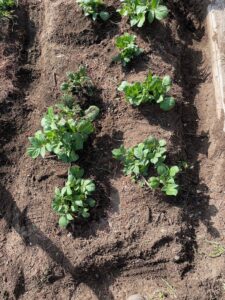子供たちといっしょに、じゃがいもの土寄せを行いました。もっと大きくなるようにお願いしながら、みんなでじゃがいもの周りに土を被せました。