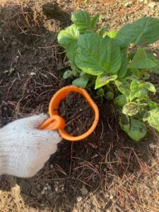 子供たちといっしょに、じゃがいもの土寄せを行いました。もっと大きくなるようにお願いしながら、みんなでじゃがいもの周りに土を被せました。