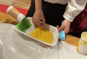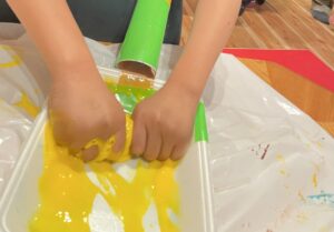 色々な色を混ぜ合わせ子ども一人ひとりの想像力を活かしてアレンジしながら遊びに参加していました(o^―^o)