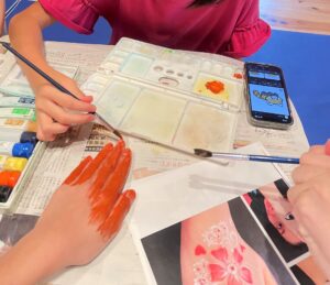 交代でお互いの手の甲に水彩絵の具で絵を描くという取り組みです。