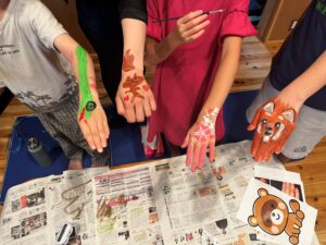 交代でお互いの手の甲に水彩絵の具で絵を描くという取り組みです。
