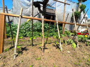 写真の手前は茄子で奥にじゃがいもが育っております。 奥のじゃがいもは7月に収穫予定です。