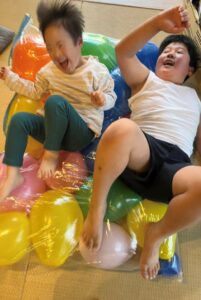 出来上がった「バルーンベッド」を手に持って踊ったり、友だちと一緒にベッドの上に寝転んだまま、はねてみたりと、