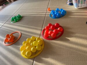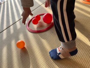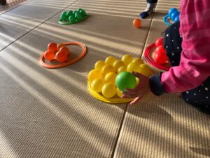 まんまるでは、カラーボールを用いて色を判断し同じ色のカラーリングにボールを入れる遊びを行いました。