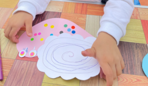 カタツムリの殻が渦巻き模様🌀になっているので、その線を色鉛筆でなぞり書き、追従性眼球運動を促します。