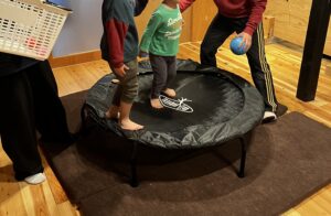 トランポリンで跳ねながらミニボールを投げたり、投げられたボールをキャッチしたりしました。