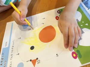 点をつなぎの後、色鉛筆で動物に色付けをしたり、線つなぎの色を変えてみたりと工夫している姿が見られました。