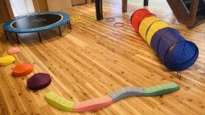 今回は、でこぼこ平均台、バランス飛び石、トランポリン、ステップカラーラバーリング、トンネルを使って幼児さん対象のバランスを重視したサーキットを作ってみました!!