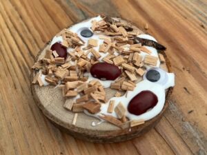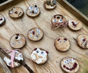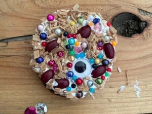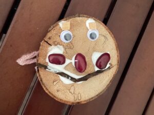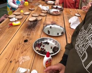 まず土台となる丸太を選びます。そこにどんぐりや小豆、木のかけらなど自然の中にある物をボンドで丸太にくっつけていきました。