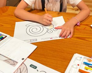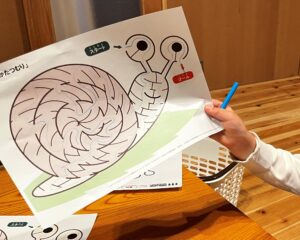 かたつむり迷路では追従性眼球運動を、塗り絵では塗り分けをする事で色覚を養いました。