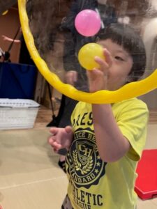 このあそびでは、取っ手のついたカラーボールを足でキャッチし、ケンケンをしてカゴに入れることで、バランス能力や連結能力を養いました。足にボールをたくさんつけて一気にカゴに入れてみたり、ケンケンが難しい子どもは座った状態でチャレンジしてみたりなど、様々な方法で挑戦する姿が見られました。
