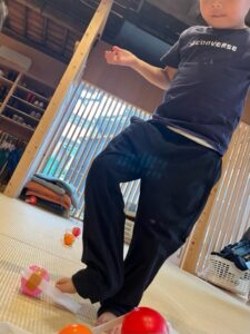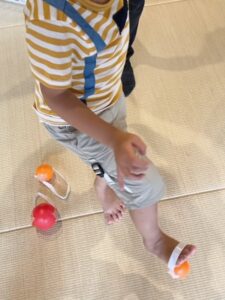 このあそびでは、取っ手のついたカラーボールを足でキャッチし、ケンケンをしてカゴに入れることで、バランス能力や連結能力を養いました。足にボールをたくさんつけて一気にカゴに入れてみたり、ケンケンが難しい子どもは座った状態でチャレンジしてみたりなど、様々な方法で挑戦する姿が見られました。