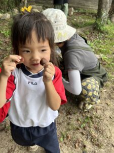 子ども達は毬栗のトゲトゲに気を付けながら上手に栗を取り出していました!