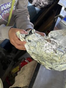 次にアルミホイルでくるみます。ここでポイントなのが、新聞紙が見えないように全てアルミホイルでくるむことです!新聞紙が出てしまっていると、焼くときに燃えてしまい焼き芋が焦げてしまう原因になります。