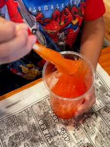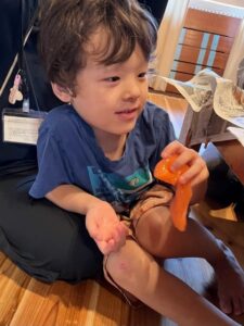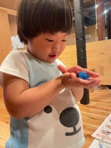 中には「この感触苦手かも…」とスライムをコップの中に戻す子どももいましたが、透明な袋にスライムを入れて手渡すと「これなら触れる!」と教えてくれ、手で触って楽しんでいました。
