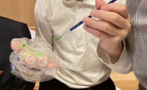 ペアになり、お互いの手に絵の具を塗って手形でクリスマスツリーを型取ります。