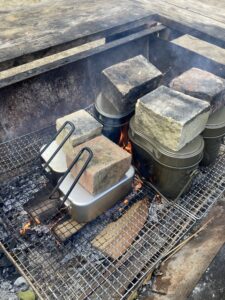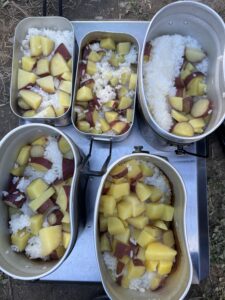 包丁で硬いさつまいもを小さくカットし飯盒にお米と一緒に入れて炊き込みました!