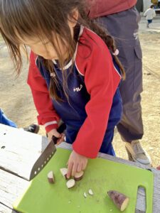 さつまいもは分厚くて硬かったですが、みんな力いっぱいに包丁を使って小さくカットすることができました!